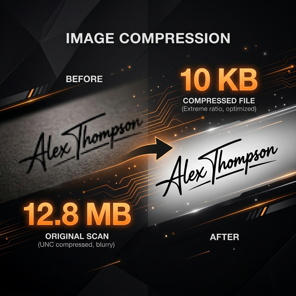 At 10KB, the "compression artifacts" become visible. This means you'll see small blocks or blurriness around sharp edges. To counter this for signatures: